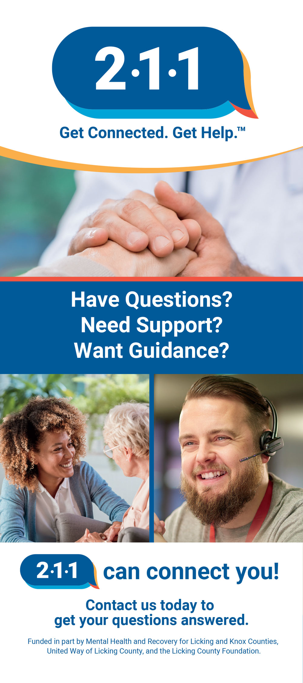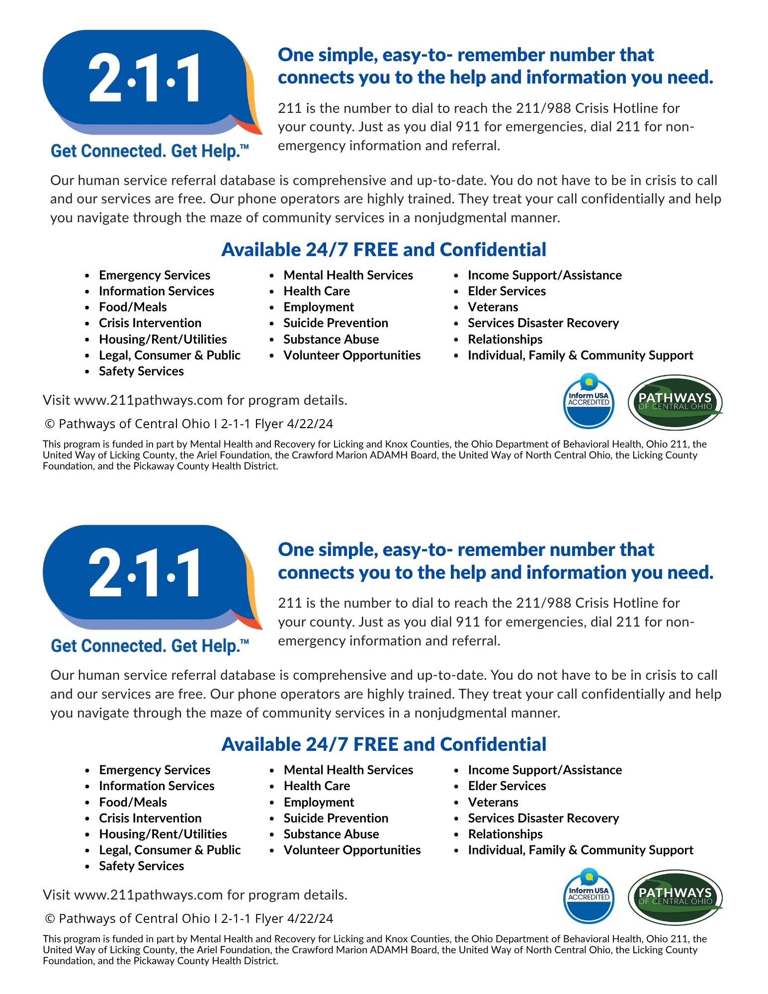- Distribute our one-page 211/988 Flyer to your employees, congregation, staff, or membership.